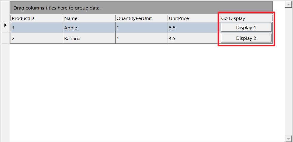 In our example, we illustrate a DataGridWindow with a column dedicated to buttons. This setup enables each row of the DataGrid to have a button that, when clicked, redirects the user to a different display.