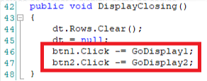 7. You should also define the removal of the click events added to the buttons when closing the display, as in the following code: