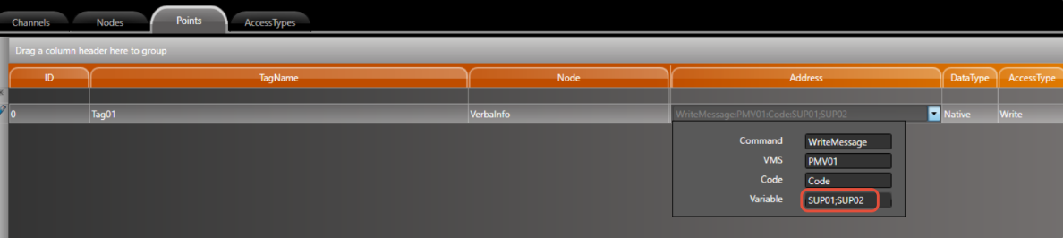 To configure the number of messages that will be sent in the same command, you can separate the variables by a semicolon (;). In the image below, we have SUP01;SUP02 that are separated by a semicolon (;). Within a PMV, these two variables must be configured for the messages to be exchanged.