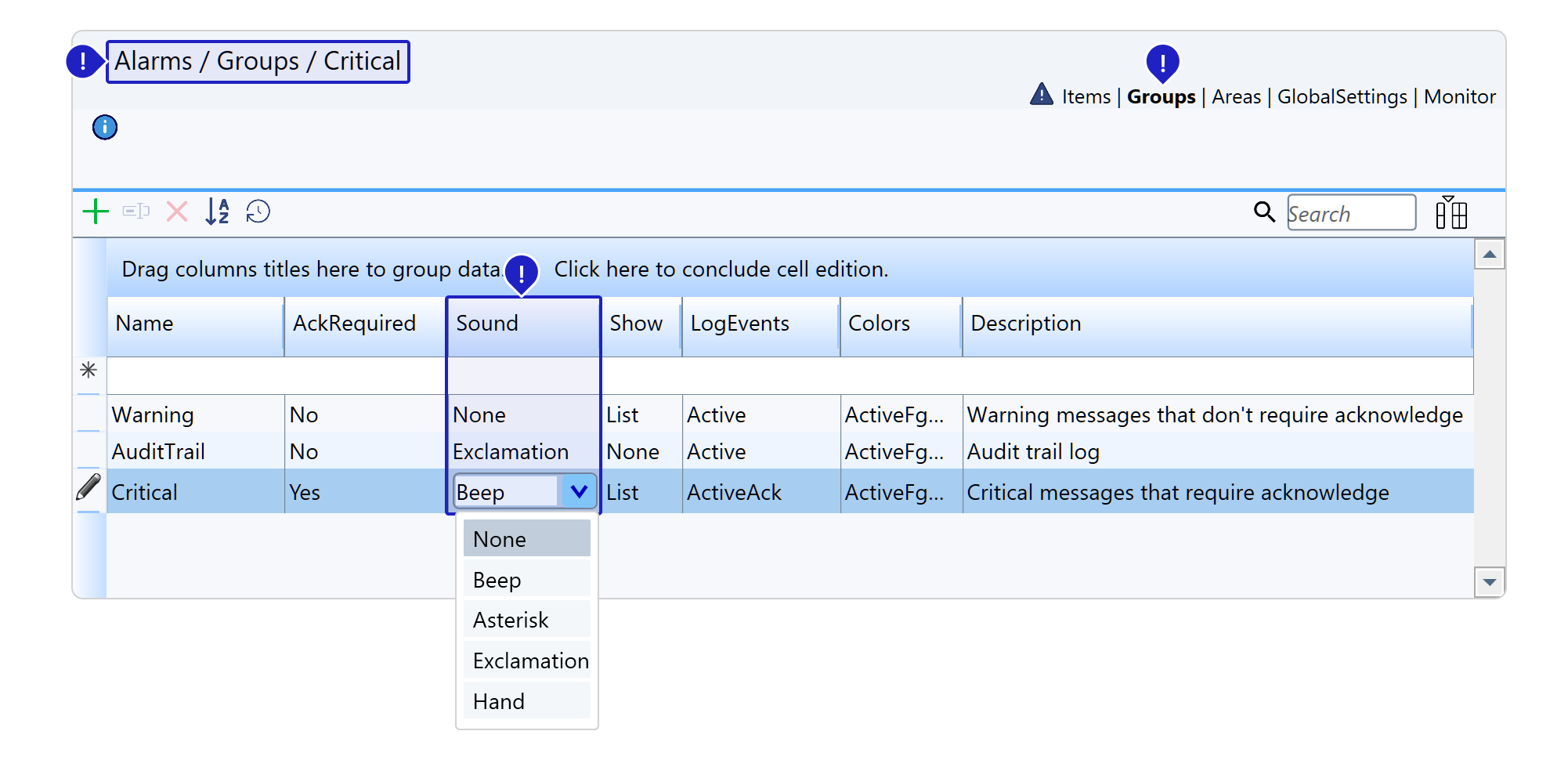 This document describes how to configure a solution so that it has different AlarmGroups with different sounds. When double-clicking the Sound column, you can choose which kind of windows sound will play when an alarm happens for that specific group.