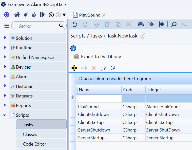 After that, create a script Task that will run every time the Alarm.TotalCount property changes. This script Task must be a Client Domain.