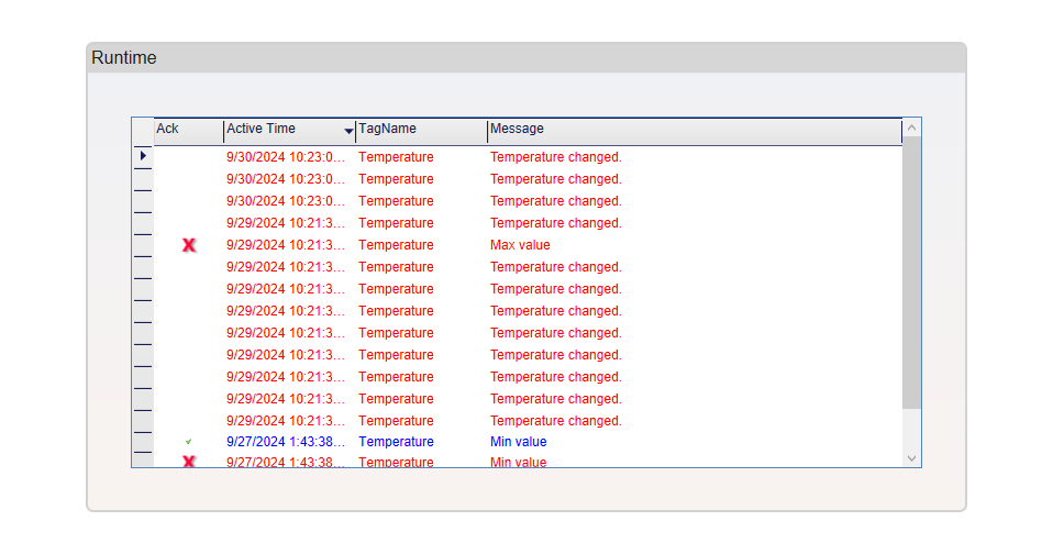 By default, into the SQL tables that register the alarm events there is a column called "Duration", since the data shown in the AlarmWindow comes from this database, viewing the duration of alarms is based on how to display this information in the AlarmViewer Control (Reference) or in a separate data grid, so this procedure requires some historical alarm data in which there was an ACK from the user.