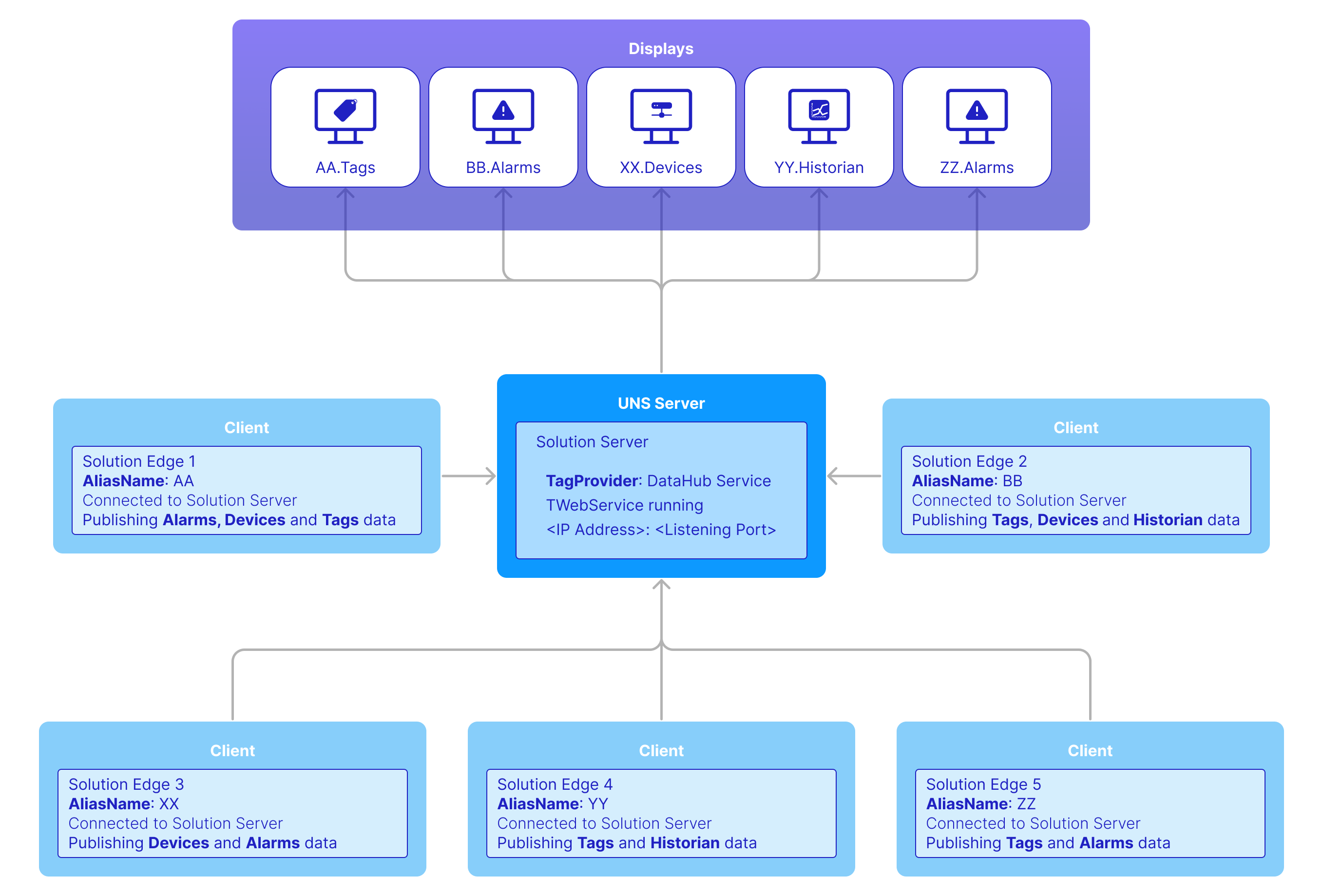 In this architecture EDGE solution 1 can send Alarms, Devices and Tags values to the UI. EDGE solution 2 can send Tags, Devices and Historian to the UI. EDGE solution 3 can send Devices and Alarms to the UI...