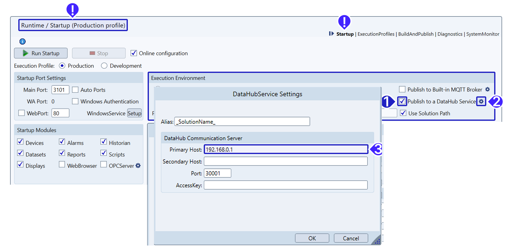Go to Runtime / Startup and check the Publish to a DataHub Service checkbox in the Execution Environment.