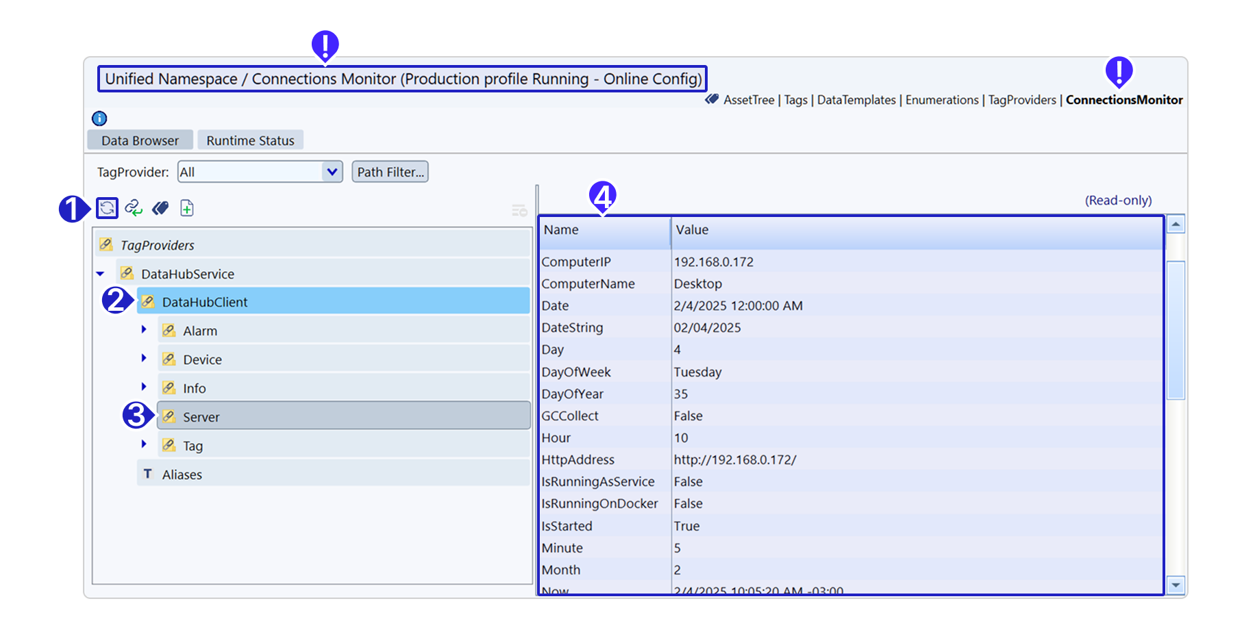 To set it up, go to Unified Namespace / TagProvider Connections and create a new connection with the DataHub Service provider, making sure to enter the correct port. The configuration is shown previously in this page.