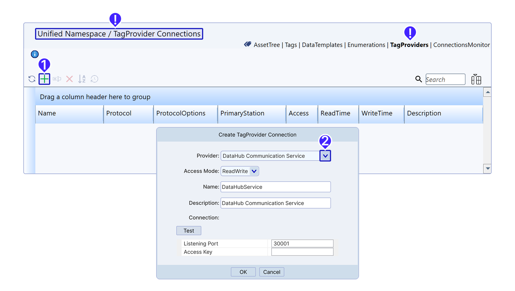 To set up a new TagProvider connection navigate to Unified Namespace/TagProvider Connections and press the add button to open the New TagProvider Connection dialog. You can also create your TagProvider Connection directly from the AssetTree. To do this, navigate to Unified Namespace/Assets Tree and press to open the New TagProvider Connection dialog. In the configuration dialog, select the DataHub Communication Service on the Provider field and insert the required connection parameters, such as the Listening port and AccessKey. Test the connection by pressing the "Test" button. After that, press the Ok button to finish the provider configuration, and it will create a folder automatically in the Assets Tree (Unified Namespace / Assets Tree).