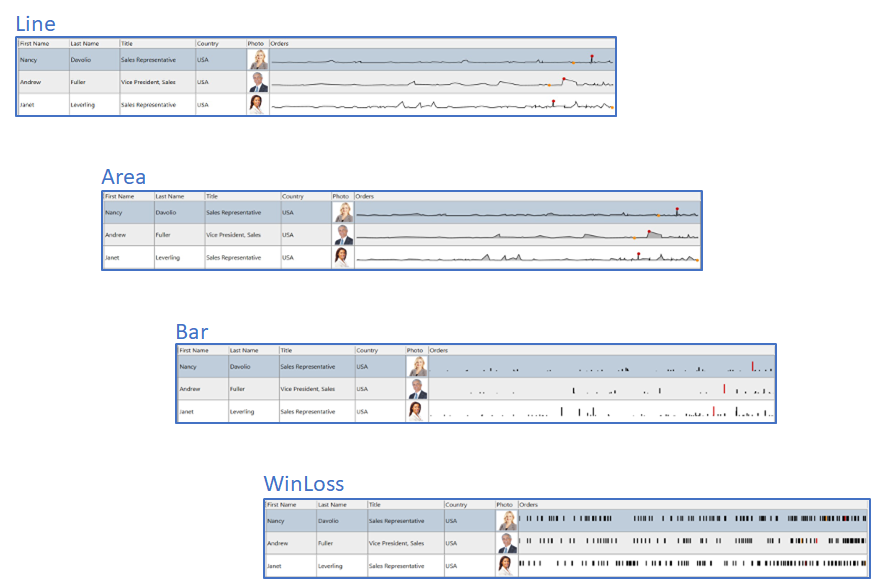 Sparklines are available in four styles: Line, Area, Bar, and WinLoss.