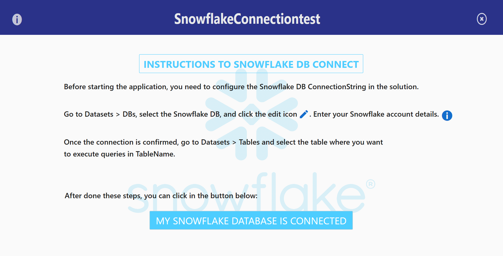 The solution's interface provides on-screen instructions to guide the user through the process of connecting to the Snowflake database and selecting the table for interaction.