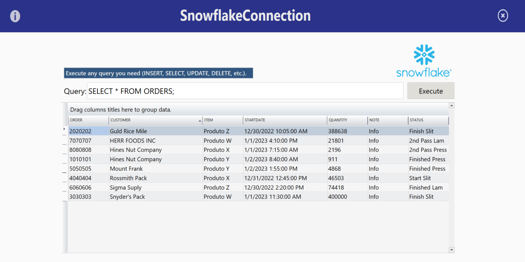 This example provides instructions on connecting to a Snowflake database and executing queries. It enables communication between the Snowflake database and the FrameworX solution, allowing data to be published and read.
