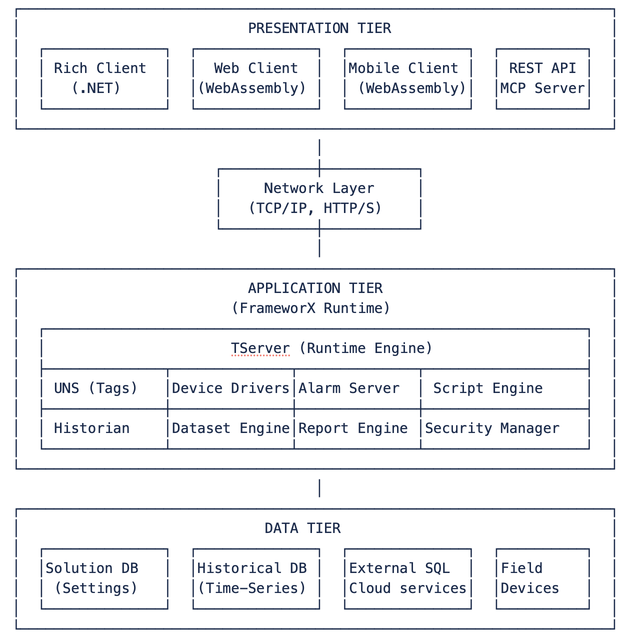 Runtime Execution is the production environment where your FrameworX solution operates in real-time. The Runtime engine (TServer) processes all solution logic, manages communication with field devices, executes scripts, logs data, and serves information to clients. Runtime provides high-performance execution with built-in redundancy, diagnostics, and hot-reload capabilities for 24/7 industrial operations.