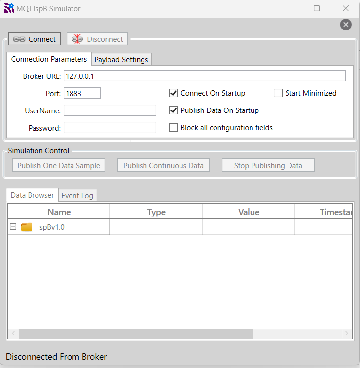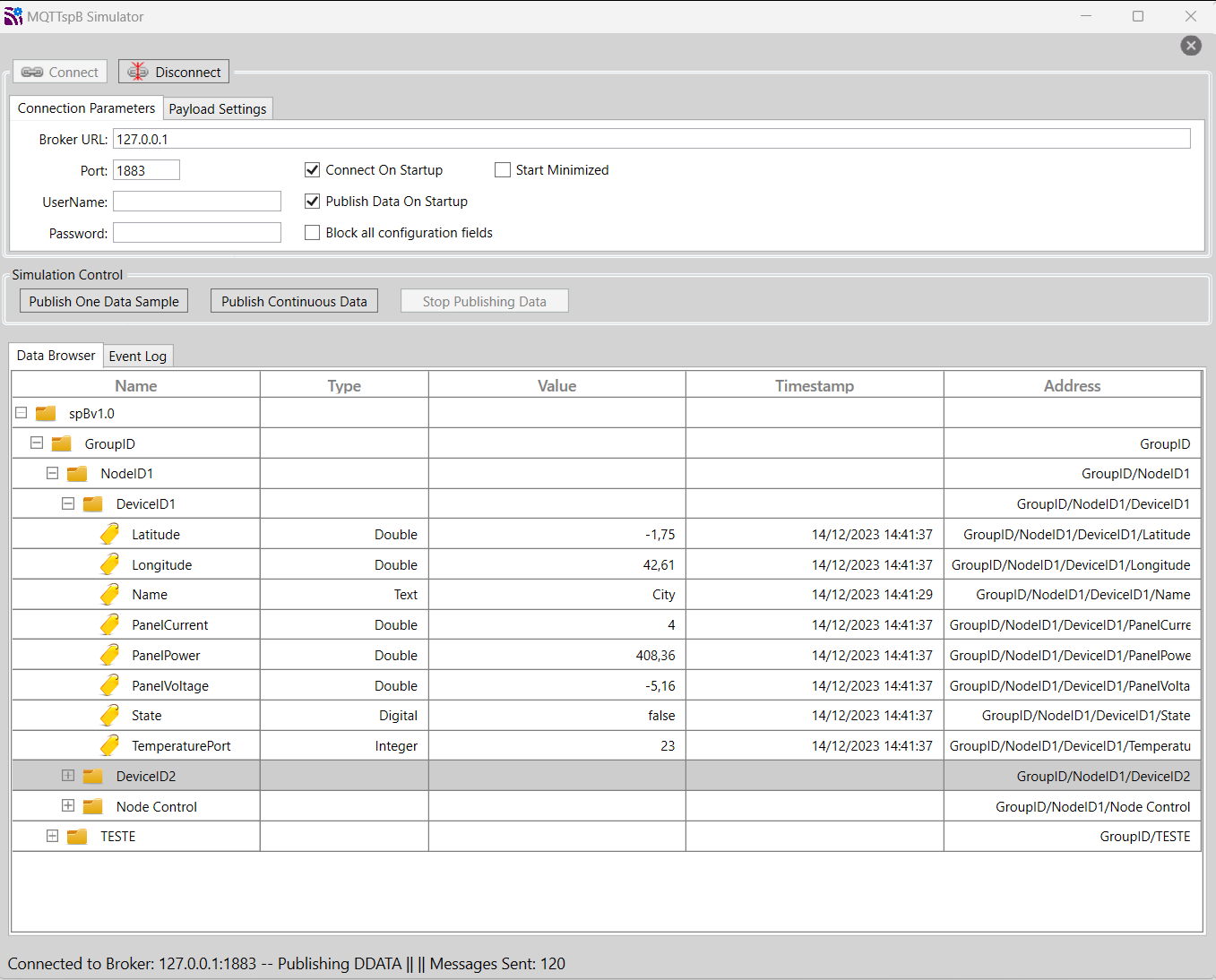 You can start the simulator using the Designer at Data Explorer / MQTT tools, or directly through the MQTTspBSimulator executable file, located inside the protocols folder of the product's installation path