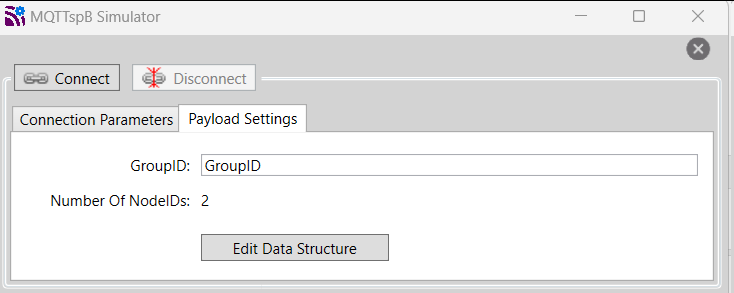 The Payload Settings of the MQTTspB Simulator Configuration dialog allow users to manage settings related to the data payload being sent, such as GroupID, Number of NodesIDs and the Edit Data Structure button.