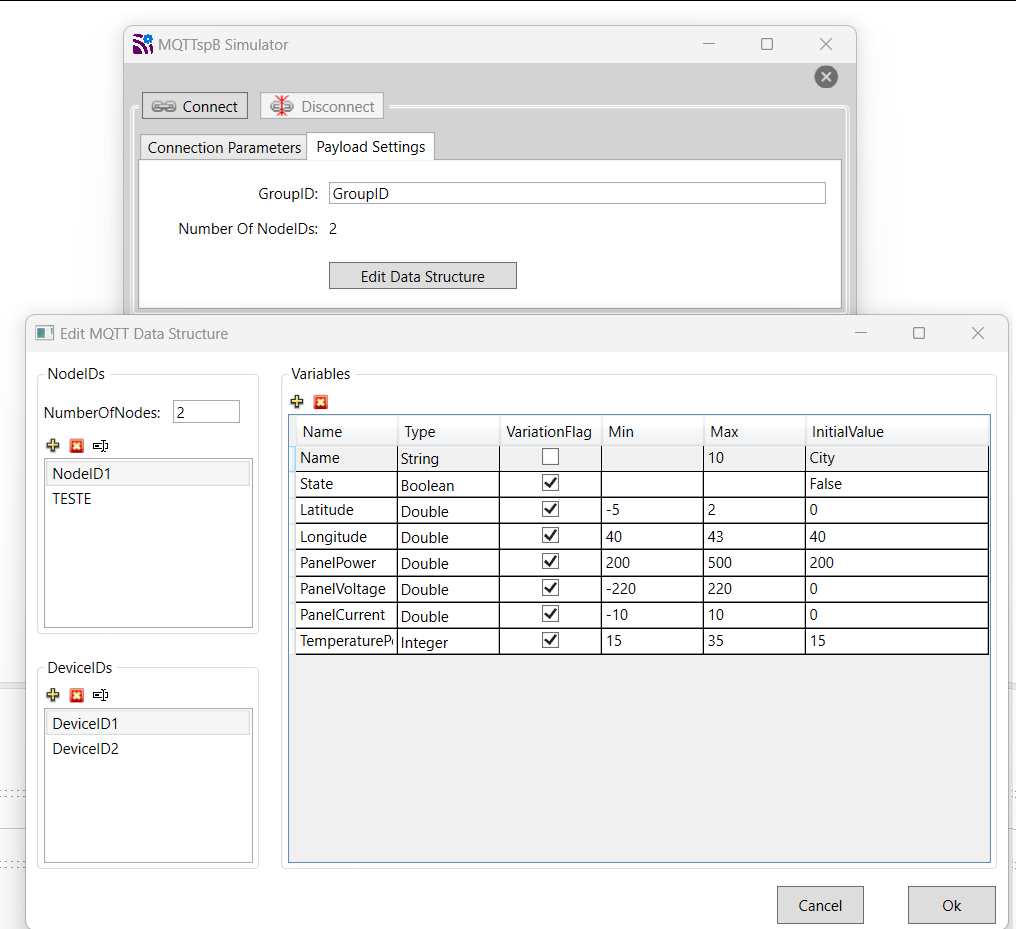 <?xml version="1.0" encoding="utf-8"?> <MQTTspBSimulator> <ConnectionParameters> <BrokerUrl>127.0.0.1</BrokerUrl> <BrokerPort>1883</BrokerPort> <UserName></UserName> <Password></Password> </ConnectionParameters> <PayloadSettings> <GroupID Name="GroupID"> <NodeIDs> <NodeID Name="NodeID1"> <DeviceIDs> <DeviceID Name="DeviceID1"> <Variables> <Variable Name="Name" Type="string" VariationFlag="false" InitialValue="City"/> <Variable Name="State" Type="boolean" VariationFlag="true"/> <Variable Name="Latitude" Type="double" VariationFlag="true" Min="-5" Max="2" InitialValue="0"/> <Variable Name="Longitude" Type="double" VariationFlag="true" Min="40" Max="43" InitialValue="40"/> <Variable Name="PanelPower" Type="double" VariationFlag="true" Min="200" Max="500" InitialValue="200"/> <Variable Name="PanelVoltage" Type="double" VariationFlag="true" Min="-220" Max="220" InitialValue="0"/> <Variable Name="PanelCurrent" Type="double" VariationFlag="true" Min="-10" Max="10" InitialValue="0"/> <Variable Name="TemperaturePort" Type="integer" VariationFlag="true" Min="15" Max="35" InitialValue="0"/> </Variables> </DeviceID> <DeviceID Name="DeviceID2"> <Variables> <Variable Name="Name" Type="string" VariationFlag="false" InitialValue="City"/> <Variable Name="State" Type="boolean" VariationFlag="true"/> <Variable Name="Latitude" Type="double" VariationFlag="true" Min="-5" Max="2" InitialValue="0"/> </Variables> </DeviceID> </DeviceIDs> </NodeID> <NodeID Name="NodeID2"> <DeviceIDs> <DeviceID Name="DeviceID1"> <Variables> <Variable Name="Name" Type="string" VariationFlag="false" InitialValue="City"/> <Variable Name="State" Type="boolean" VariationFlag="true"/> <Variable Name="Latitude" Type="double" VariationFlag="true" Min="-5" Max="2" InitialValue="0"/> <Variable Name="Longitude" Type="double" VariationFlag="true" Min="40" Max="43" InitialValue="40"/> <Variable Name="PanelPower" Type="double" VariationFlag="true" Min="200" Max="500" InitialValue="200"/> <Variable Name="PanelVoltage" Type="double" VariationFlag="true" Min="-220" Max="220" InitialValue="0"/> <Variable Name="PanelCurrent" Type="double" VariationFlag="true" Min="-10" Max="10" InitialValue="0"/> <Variable Name="TemperaturePort" Type="integer" VariationFlag="true" Min="15" Max="35" InitialValue="0"/> </Variables> </DeviceID> <DeviceID Name="DeviceID2"> <Variables> <Variable Name="Name" Type="string" VariationFlag="false" InitialValue="City"/> <Variable Name="State" Type="boolean" VariationFlag="true"/> <Variable Name="Latitude" Type="double" VariationFlag="true" Min="-5" Max="2" InitialValue="0"/> </Variables> </DeviceID> </DeviceIDs> </NodeID> </NodeIDs> </GroupID> </PayloadSettings> <SimulatorControl> <ConnectOnStartup>false</ConnectOnStartup> <PublishDataOnStartup>false</PublishDataOnStartup> <Minimized>false</Minimized> <BlockConfigurationFields>false</BlockConfigurationFields> </SimulatorControl> </MQTTspBSimulator>