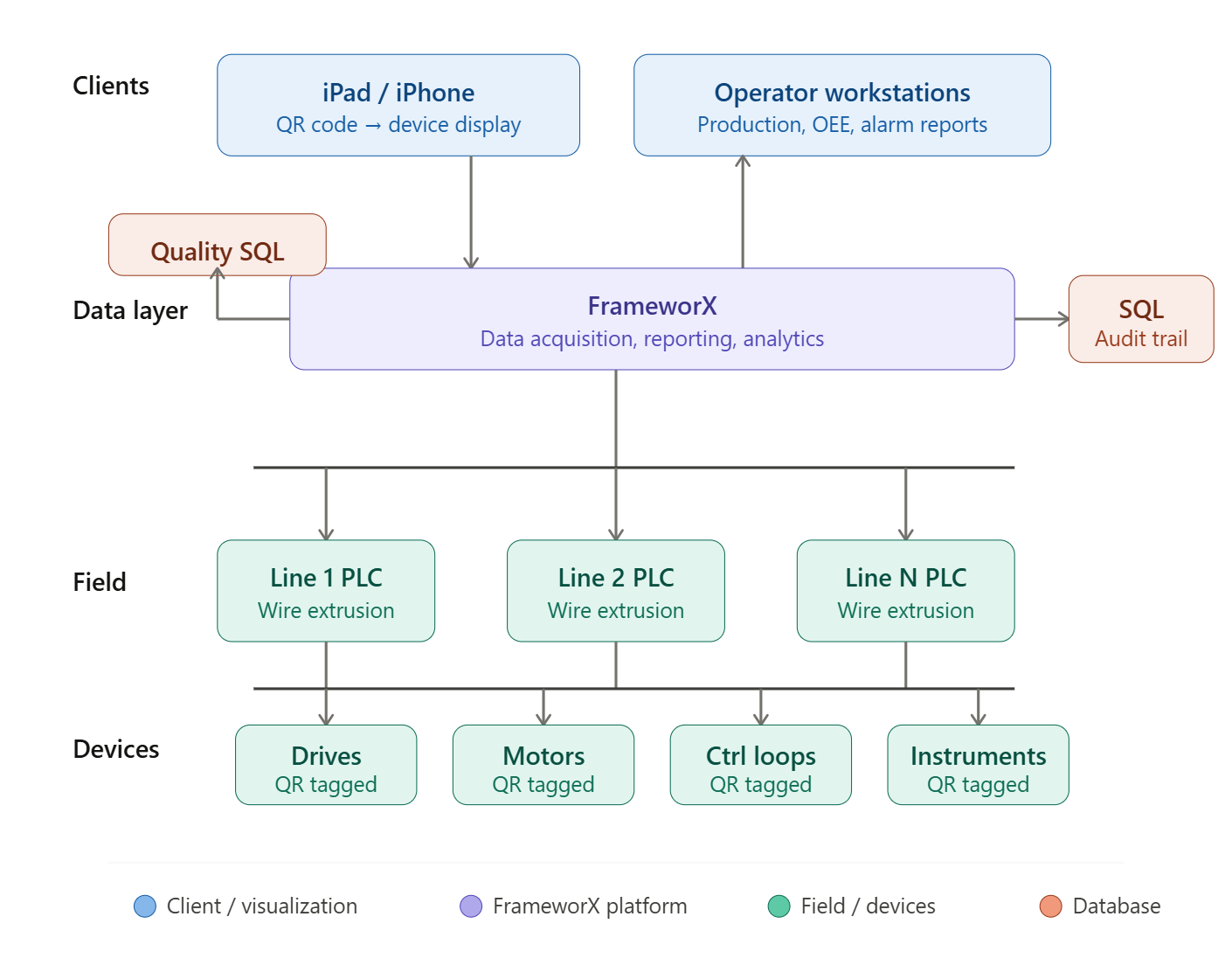 Data acquisition and analytics layer with QR code mobility for wire extrusion production lines.