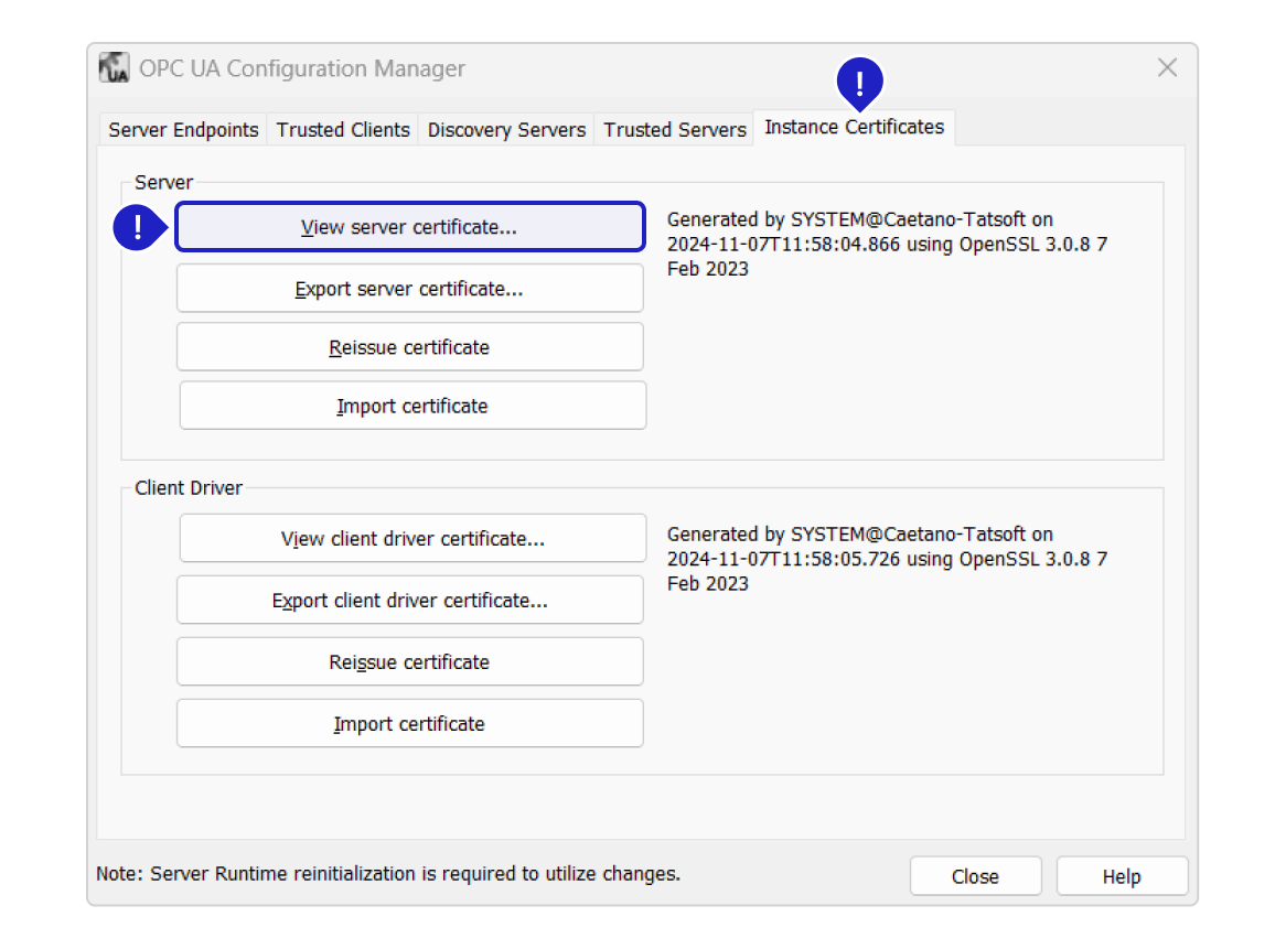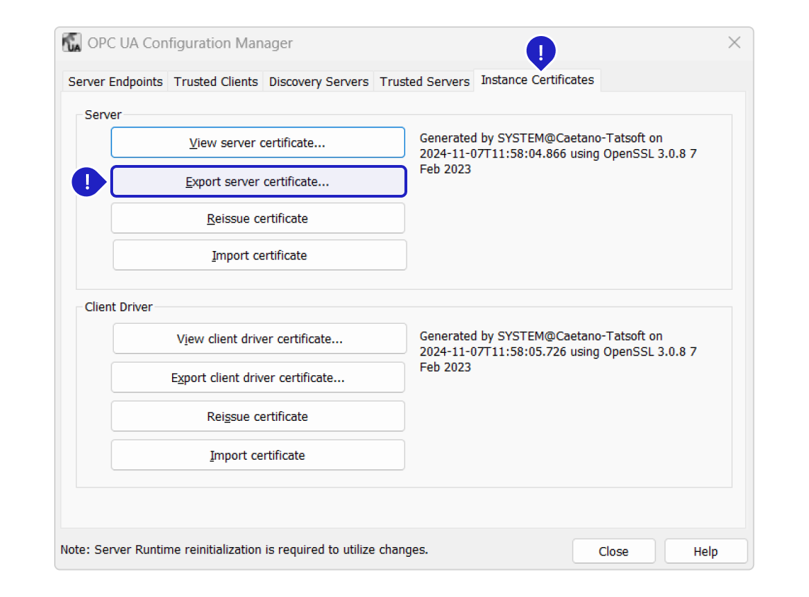 3 - Open the OPC UA Configuration, navigate to Instance Certificates and click Export server certificate;