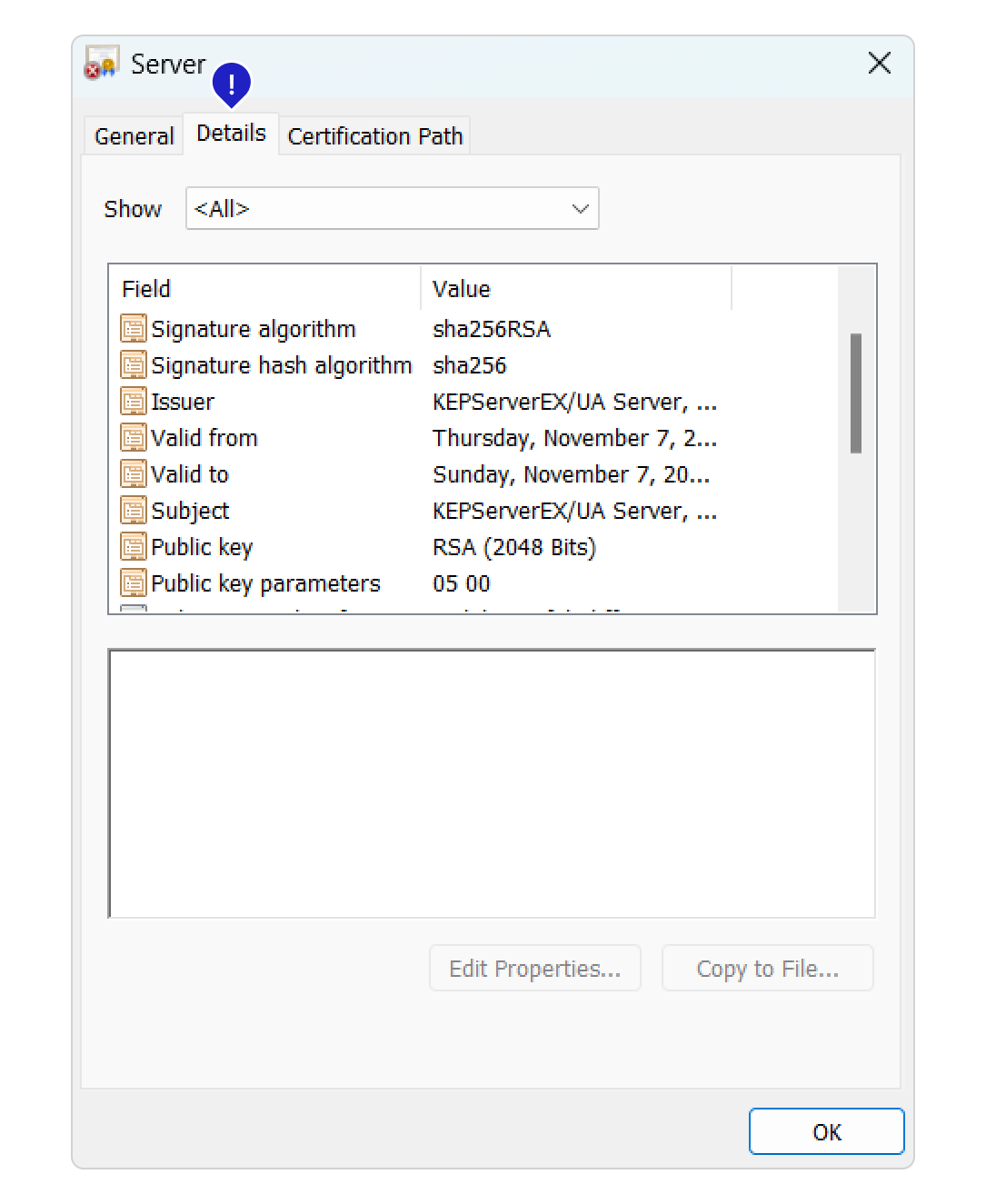 This page provides a detailed guide on how to establish a secure connection to Kepware with security policies enabled. It includes step-by-step instructions for configuring the necessary settings, activating security features, and verifying successful and secure communication between the client and server.
