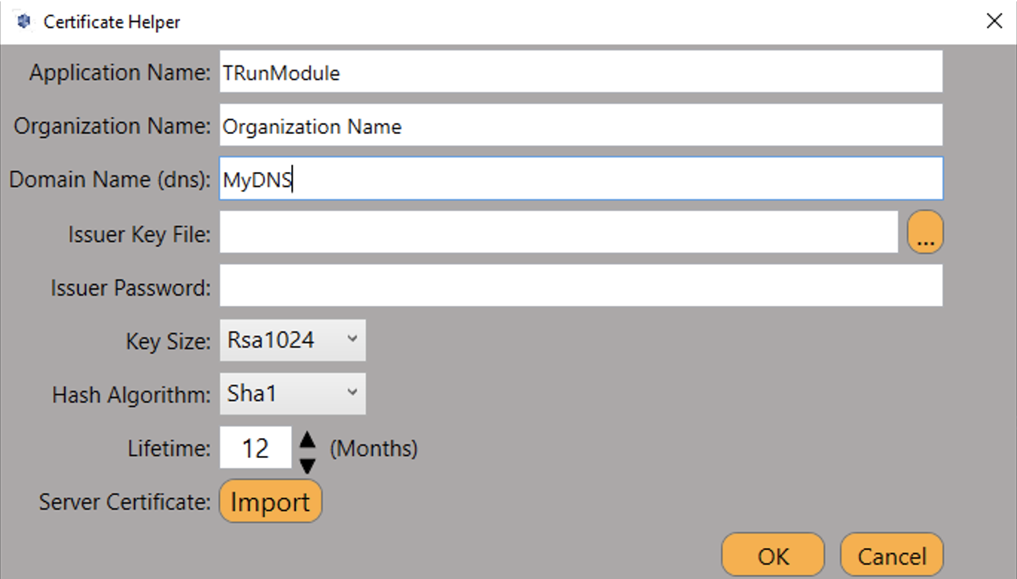 In Devices → Nodes, the user can access this feature by clicking the Custom button. The ClientCertificateHelper application should open. Fill the input fields and save the certificate file.