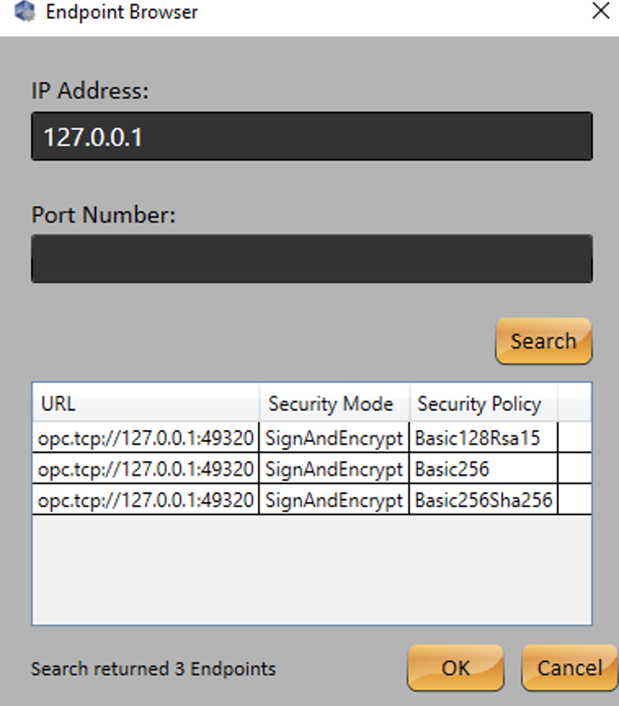 You can use the Discovery button to search for the OPC Servers located in a specific IP address and port. If the port number is left empty, the utility will look for Servers on pre-defined ports (4840, 49320, 62841, 4845, 49380).