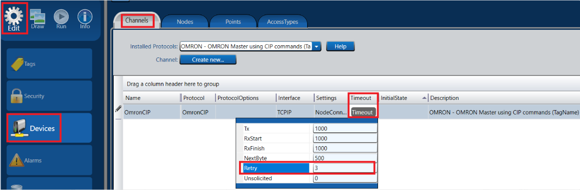 Add value 3 to retry property, in Edit > Devices > Channels > Timeout, like the image bellow: