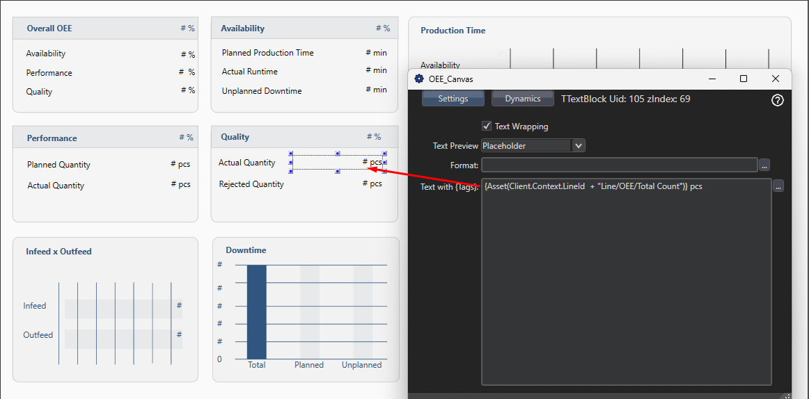 Example: {Asset(Client.Context.LineId + "Line/OEE/Total Count")} pcs