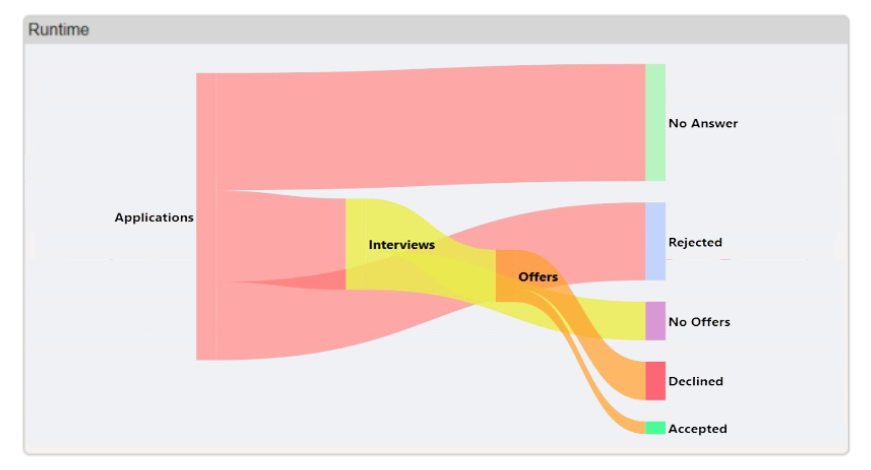 At runtime, the SankeyChart control generates a Sankey diagram based on the configured parameters. When the runtime environment starts, the control renders the diagram according to the defined settings. The diagram supports interaction and dynamically responds to configuration changes, enabling analysis of data flows and relationships within the application.