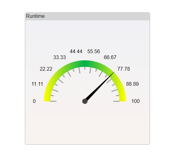 During runtime, the SemiCircleCircularGauge control operates as an interactive display, representing data within a semi-circular format. Users have previously configured the gauge with a title, header and label font sizes, data source linkage, and range values. The rim thickness and stroke width are also set according to the application’s design requirements. As the target data changes, the gauge reflects these updates, integrating seamlessly into dashboards or reports for real-time data visualization. This control aids users in distinguishing different data segments, with the top semi-circle effectively showcasing the value in a visually concise manner.
