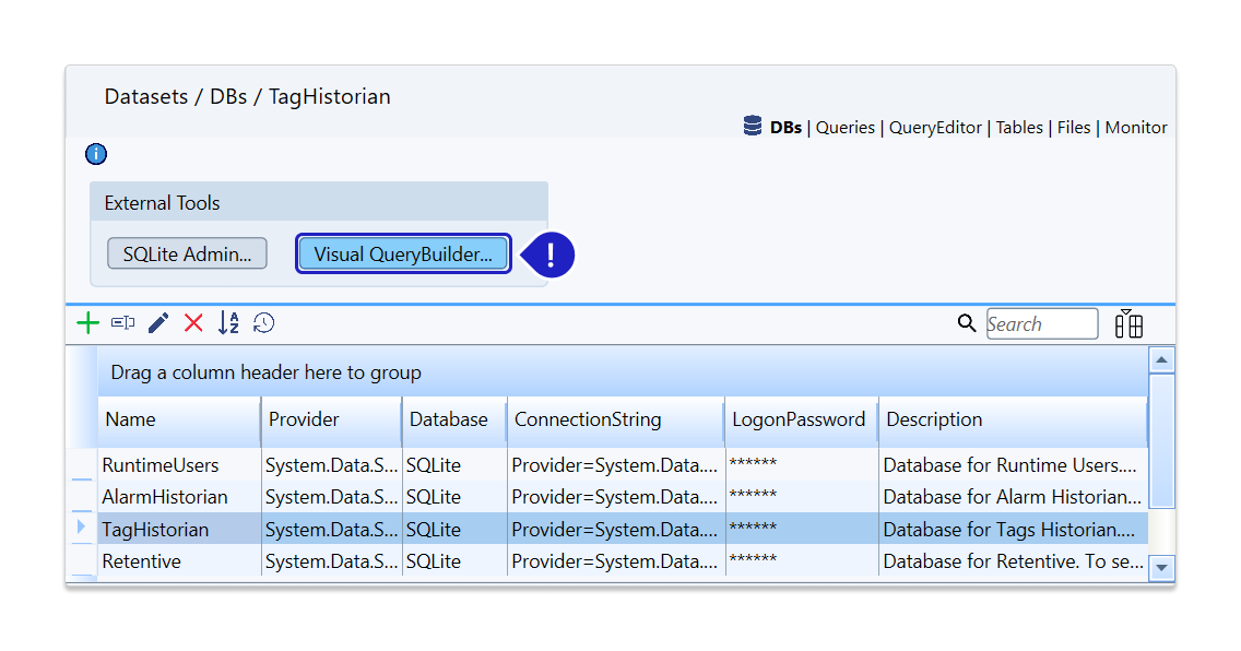 The Visual Query Builder runs as an independent tools in its own window. You can access it at the page Datasets / DBs.
