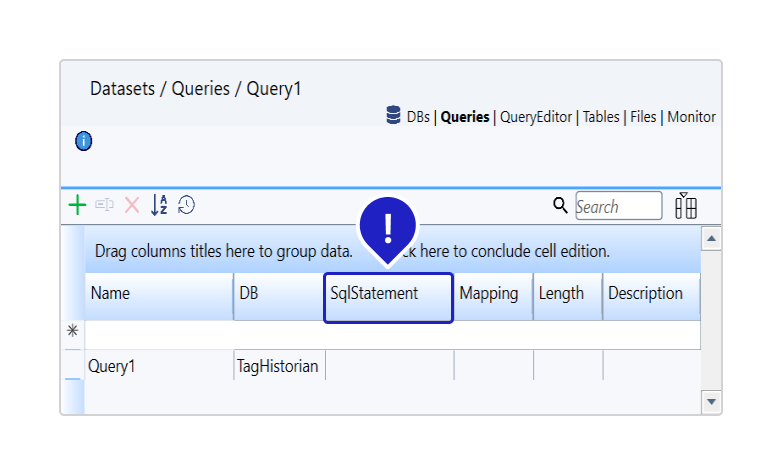 @Dataset.Query.Query1.SqlStatement = "select ? from Table1 where UTCTimestampTicks>=" + StartTime.UtcTicks + "and UTCTimestampTicks<=" + EndTime.Utc Ticks + ""; @Tag.TableTag = @Dataset.Query.Query1.SelectCommand();