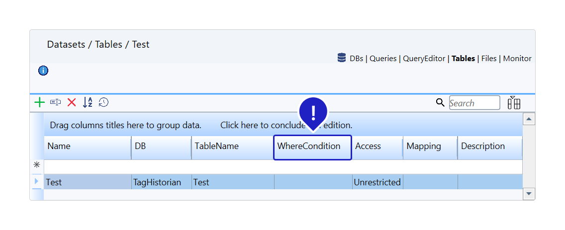 The first location you can use is the WhereCondition. In this case, the data query will be performed in a table, created at Datasets → Tables. Since the table is already selected, you only need to supply the conditional. You must also run SelectCommand to update the query.