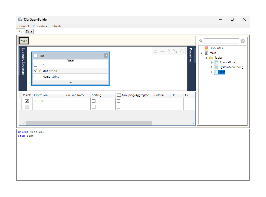 But, in some cases, it would be useful to create a query visually, dragging and dropping connections among the tables. That is purpose of the Tool "Visual Query Builder".