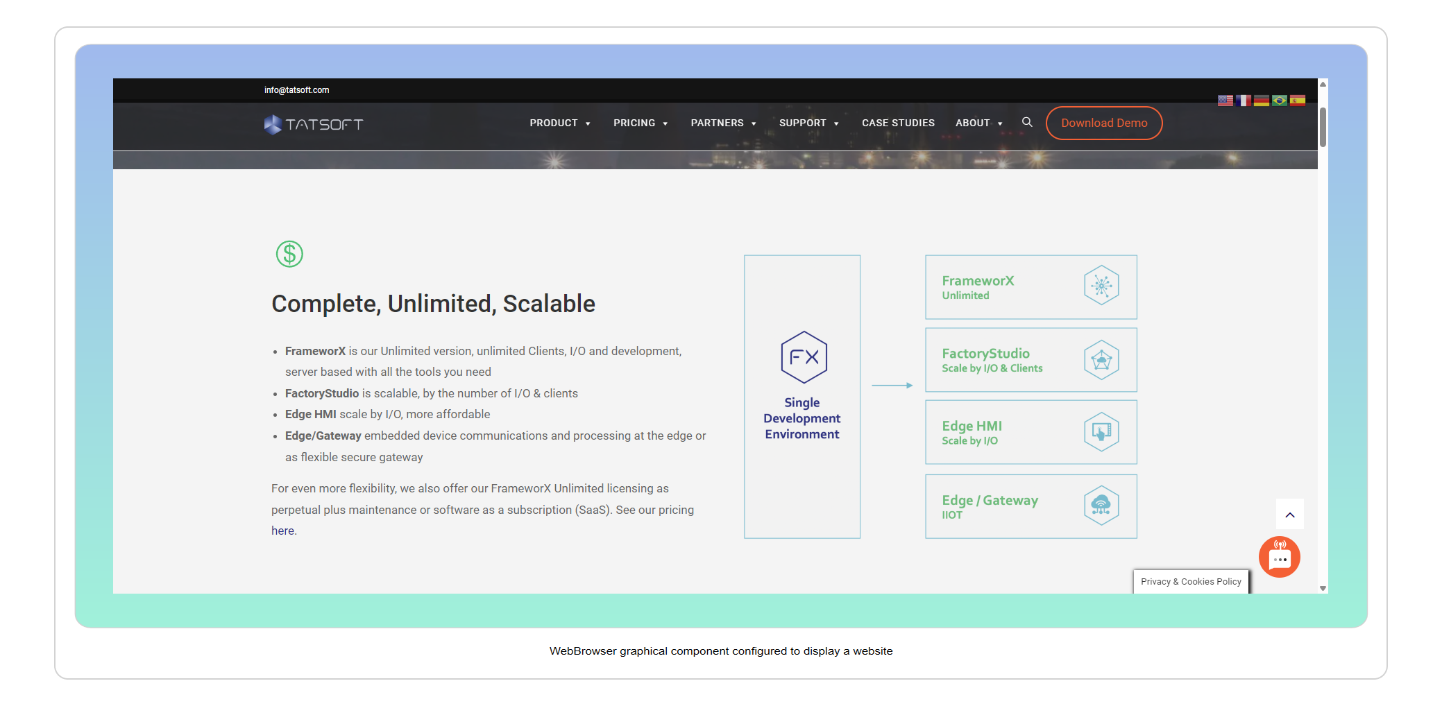 The WebBrowser graphical component integrates web pages into a single interface by linking a web page using the URL field in its settings. It allows users to interact with specific web pages within a unified platform.