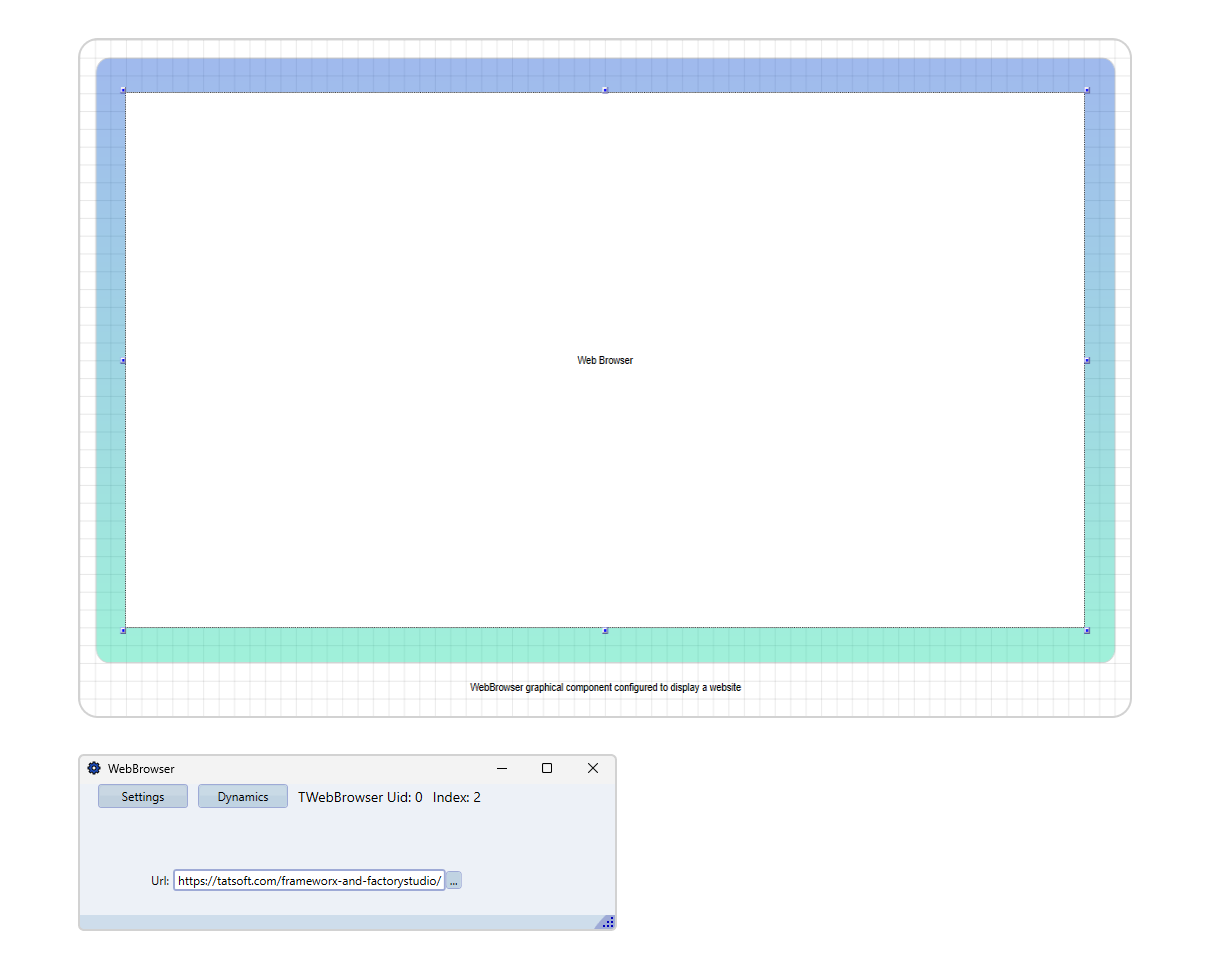 During runtime, the WebBrowser component displays an embedded browser, enabling seamless navigation and interaction using the specified URL.