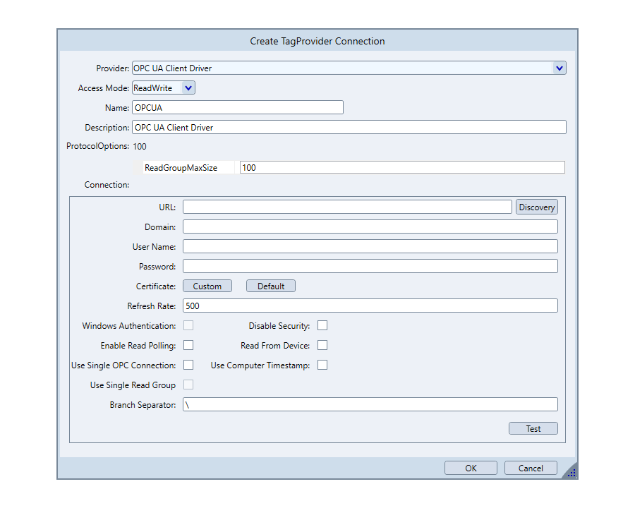 Connection | Defines connection string for the OPC UA server settings, including URL, domain, username, password, certificate, and additional options. |