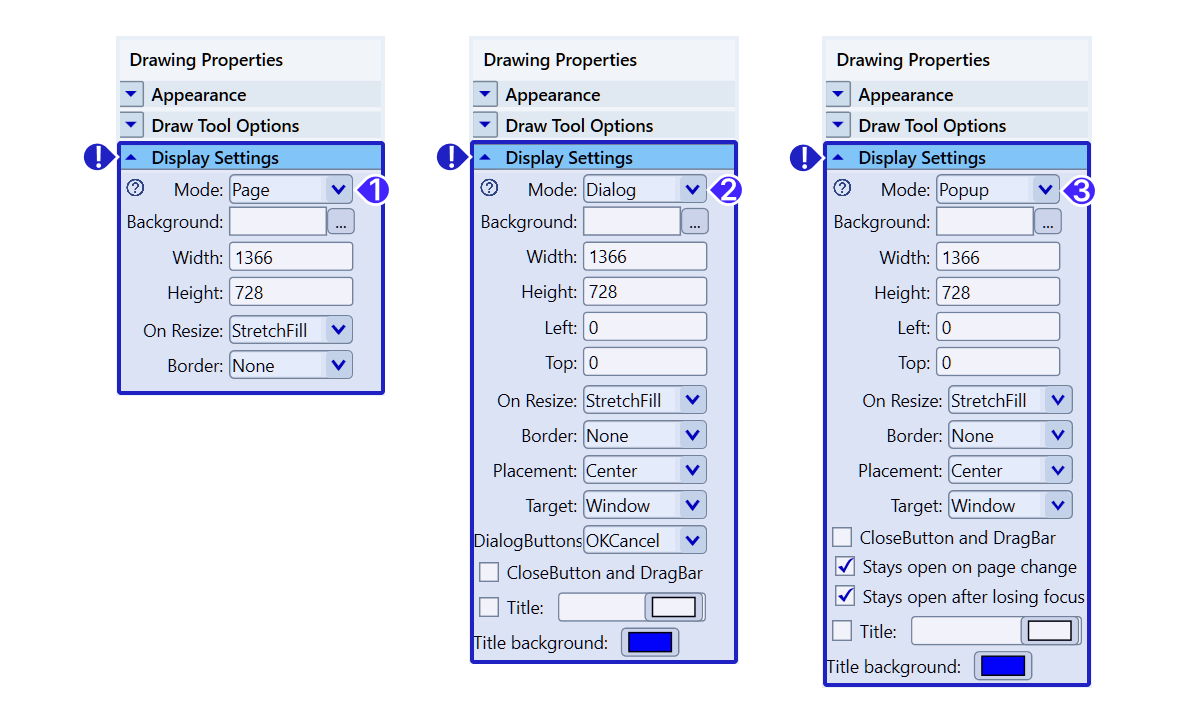 Display Settings (Reference) configure display-level properties including mode (Page/Popup/Dialog), resize behavior, borders, and placement options within the Drawing workspace.