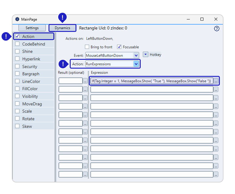 Result (optional): Enter the tag or the property that will receive the expression value.