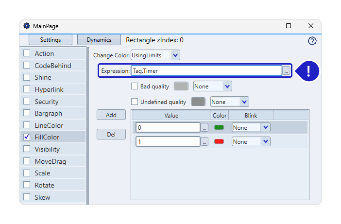 The Dynamic Properties feature allows connecting the properties of the graphical UI elements, such as color, position, and others, to the values of tags and other real-time values from the runtime namespaces. It also enables defining custom actions for mouse and keyboard interactions, input and output text, and executing scripts when the screen's UI element is enabled.