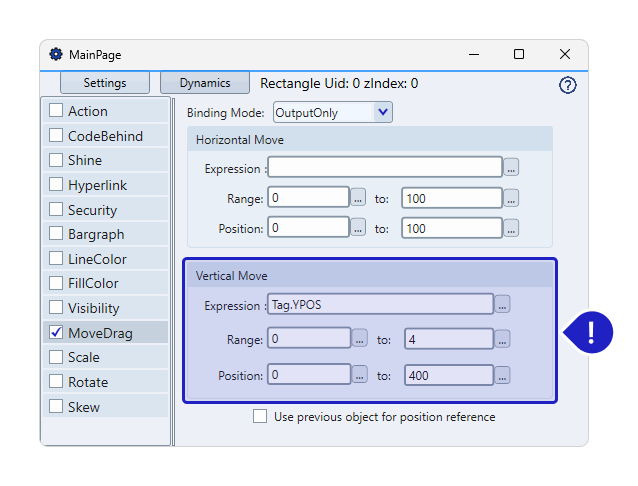 MoveDrag Dynamics is a feature for dynamically moving objects in a display, commonly used in interactive applications and user interfaces. It can be configured with different modes, expressions, and settings, and even use previous objects as a reference for position. This tool is powerful for creating dynamic and interactive solutions.