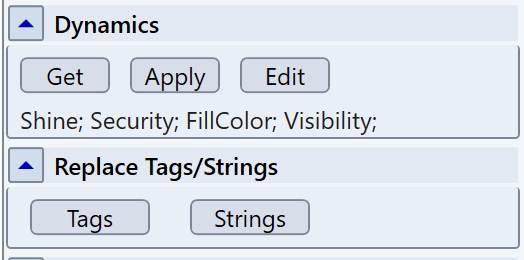 In the left panel, under Drawing Properties, you'll find the Dynamics options, which contain the Get, Apply and Edit buttons. Edit will simply open the Dynamics Configuration of the selected object, but Get and Apply allow you copy and paste dynamics' settings configuration from one object to another.