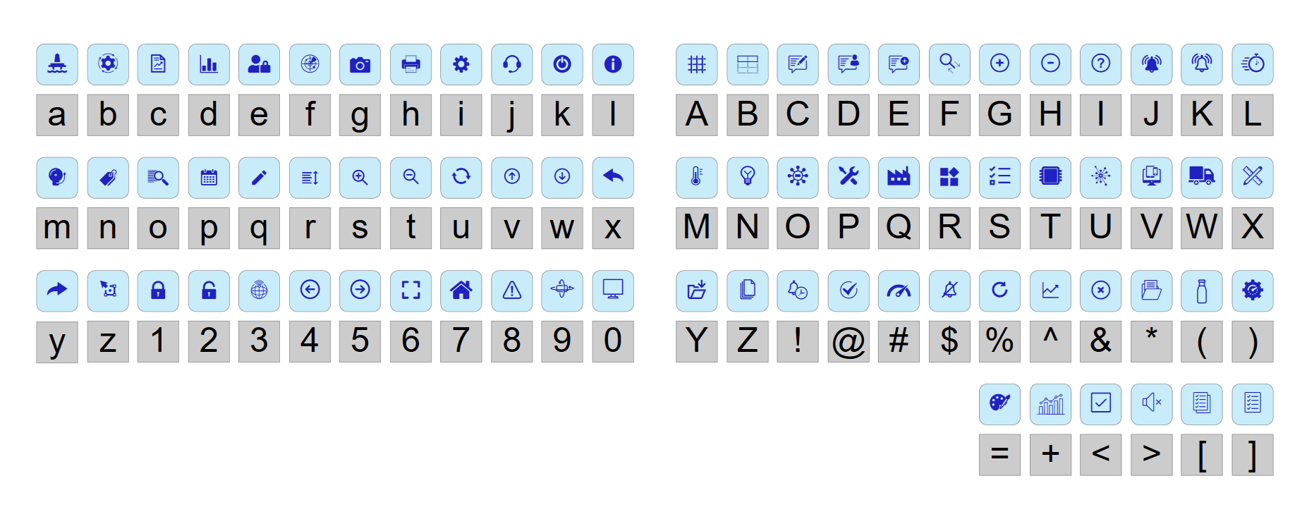 The industrial icon font family approach converts alphanumeric characters into icons using a character-to-icon conversion table.
