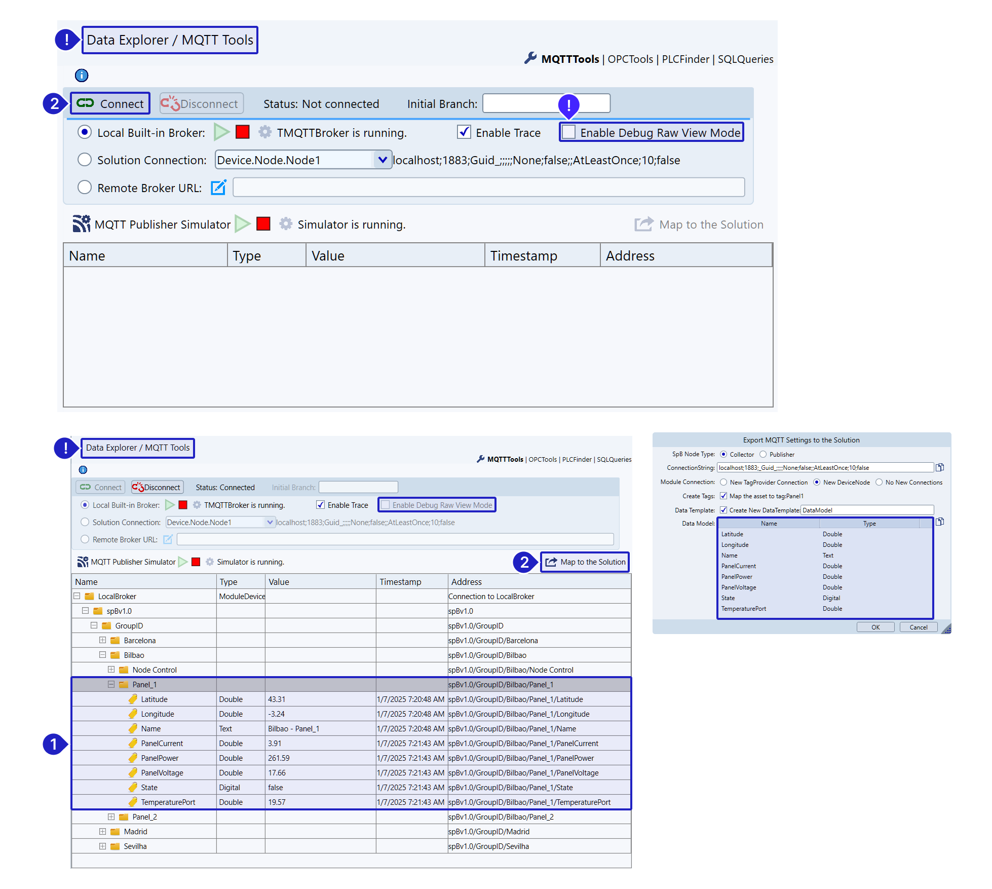 It will enable Map to the Solution button on the left-corner of the data table, clicking this button will open the Export MQTT Settings to the Solution dialog.