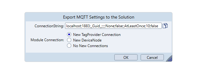 Specifies how the solution integrates the MQTT source at a module level. The selection determines if it creates a new TagProvider connection, a new DeviceNode, or no additional connections. The options available are: