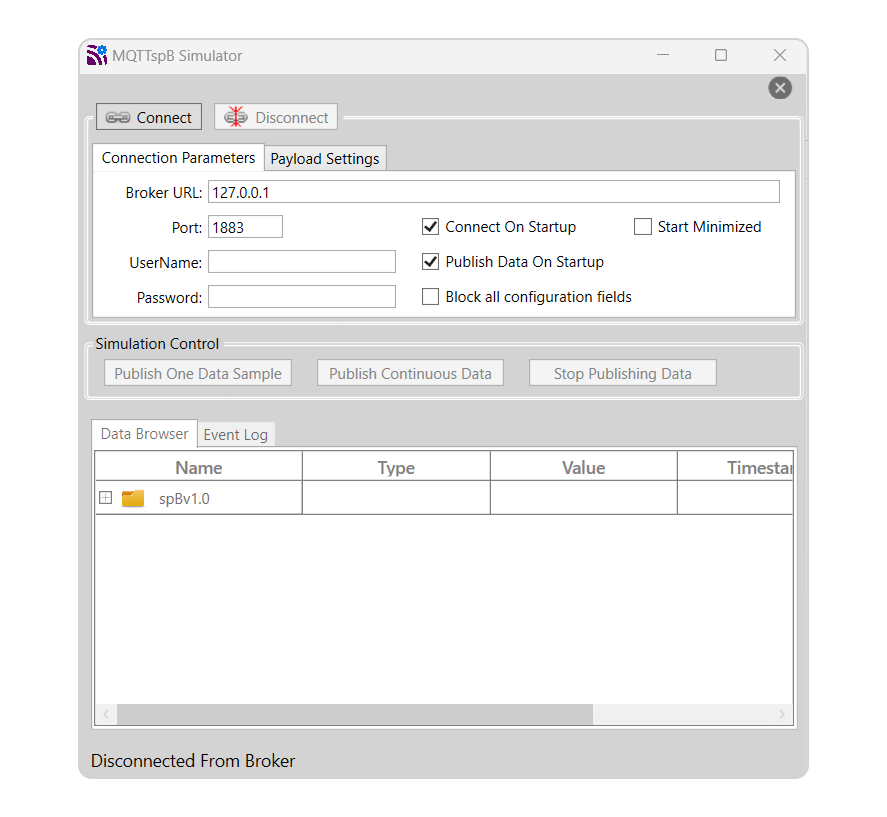 The MQTT Publish Simulator, allows to run a MQTT Client application that publishes data using SparkplugB.