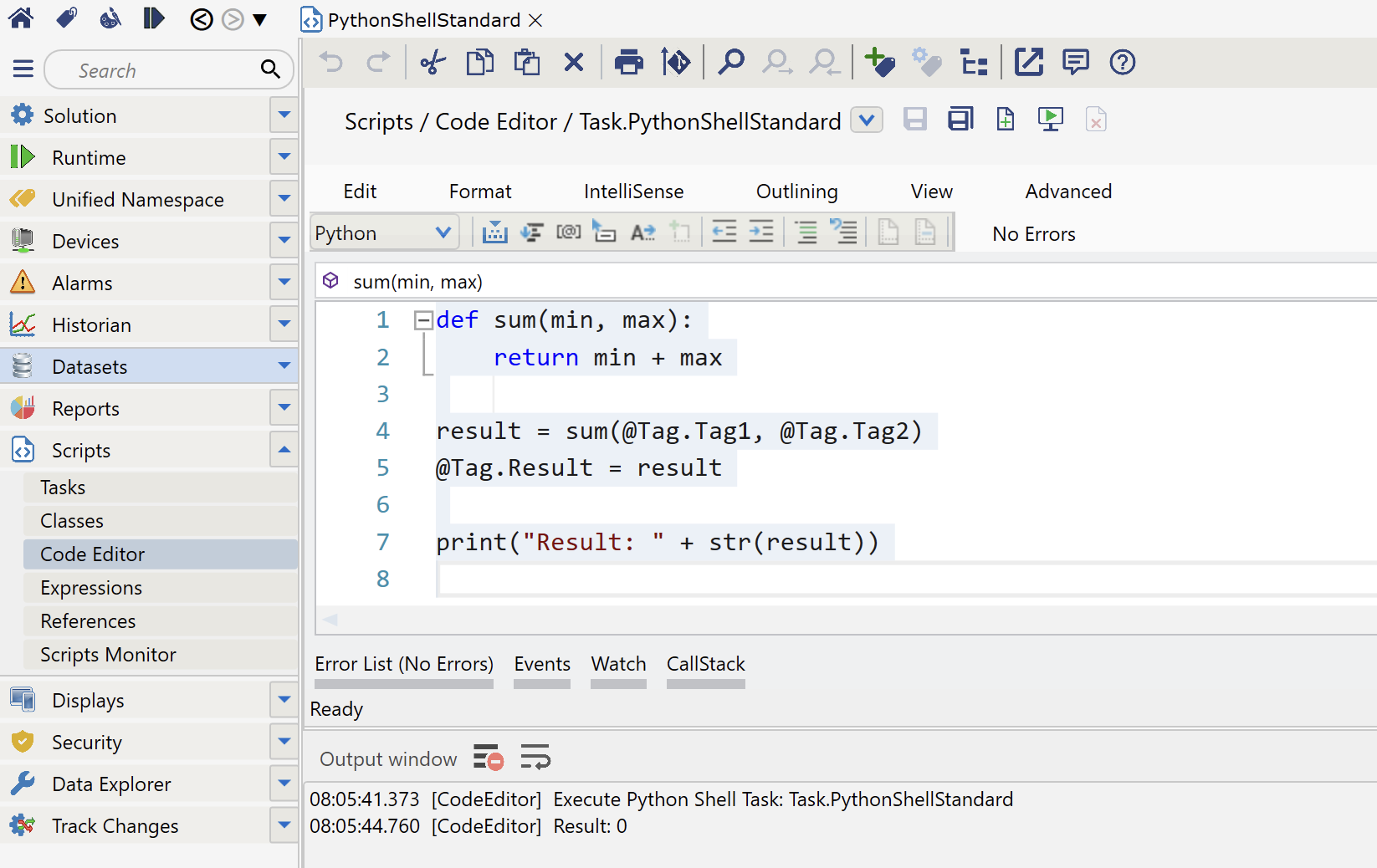 The Python Example illustrates how to use the Python and .NET languages for the Scripts.