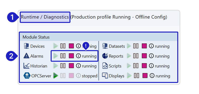 You can control the Alarms Module execution while running your solution. You can Run, Pause, or Stop the Alarms Module directly from the platform.