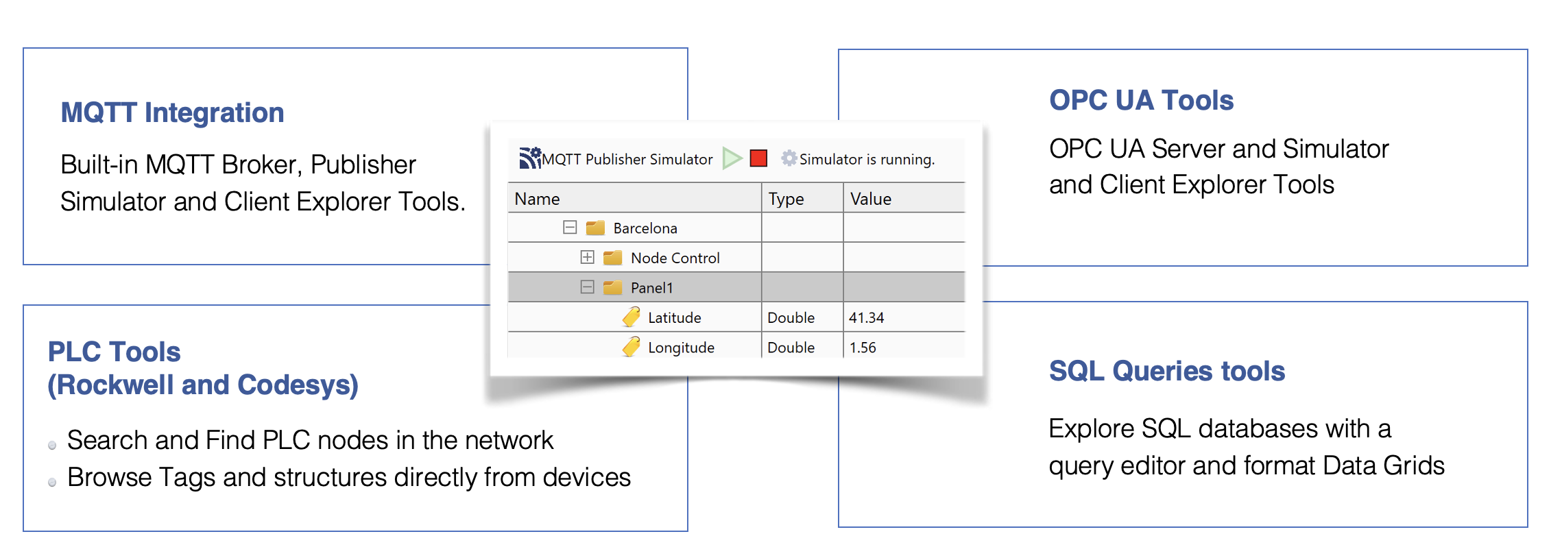 Includes new MQTT, OPC, SQL, and PLC tools with network finder for ControlLogix, and Codesys PLCs. OPC UA and MQTT SpB simulators.