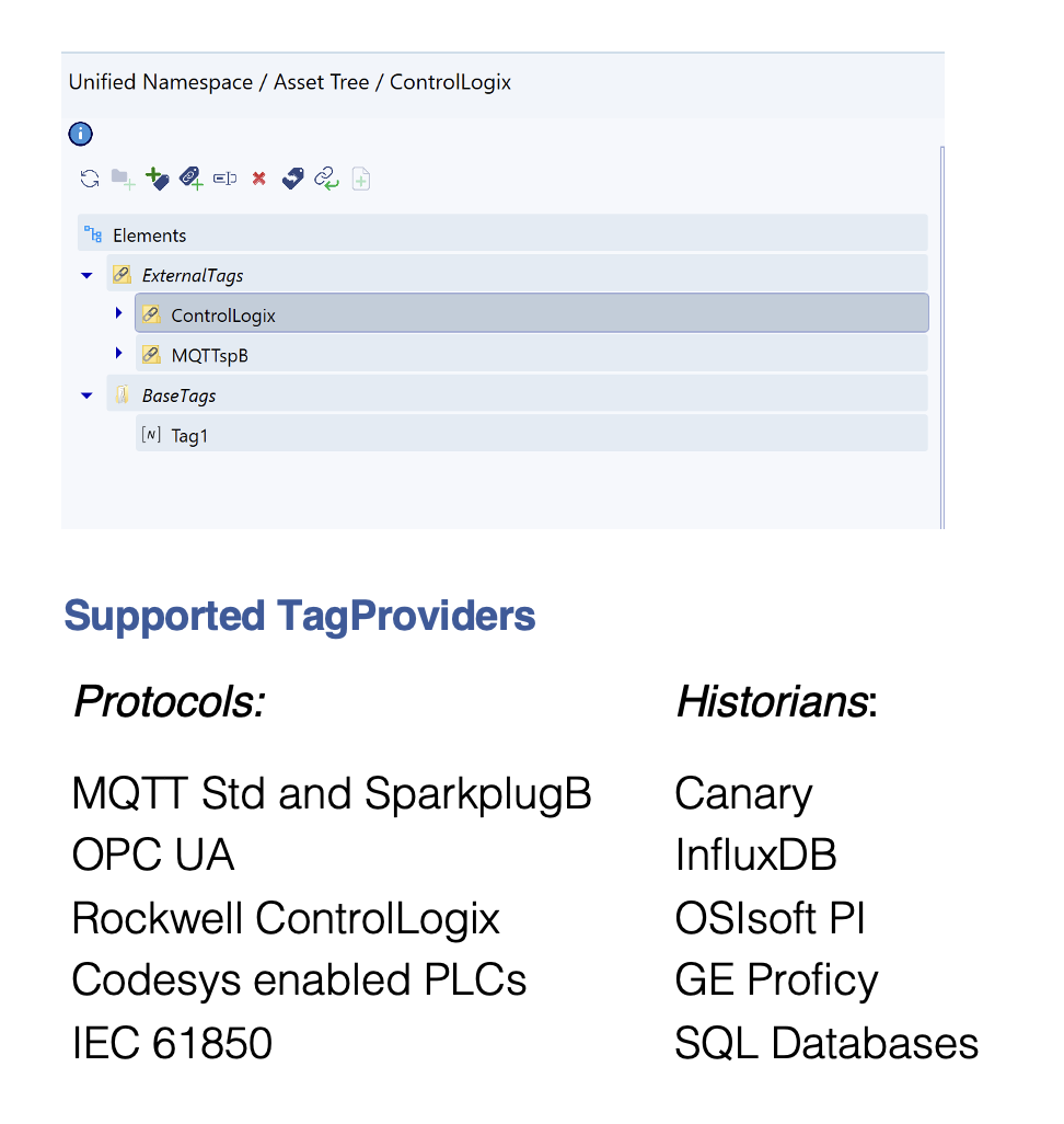 - New TagProviders Connections allow you to consume data defined and hosted in external systems. You can now connect to InfluxDB, GE Historian, and OSIsoft PI, enabling concurrent use of external sources with the built-in native historians: SQL Database and Canary Historian.