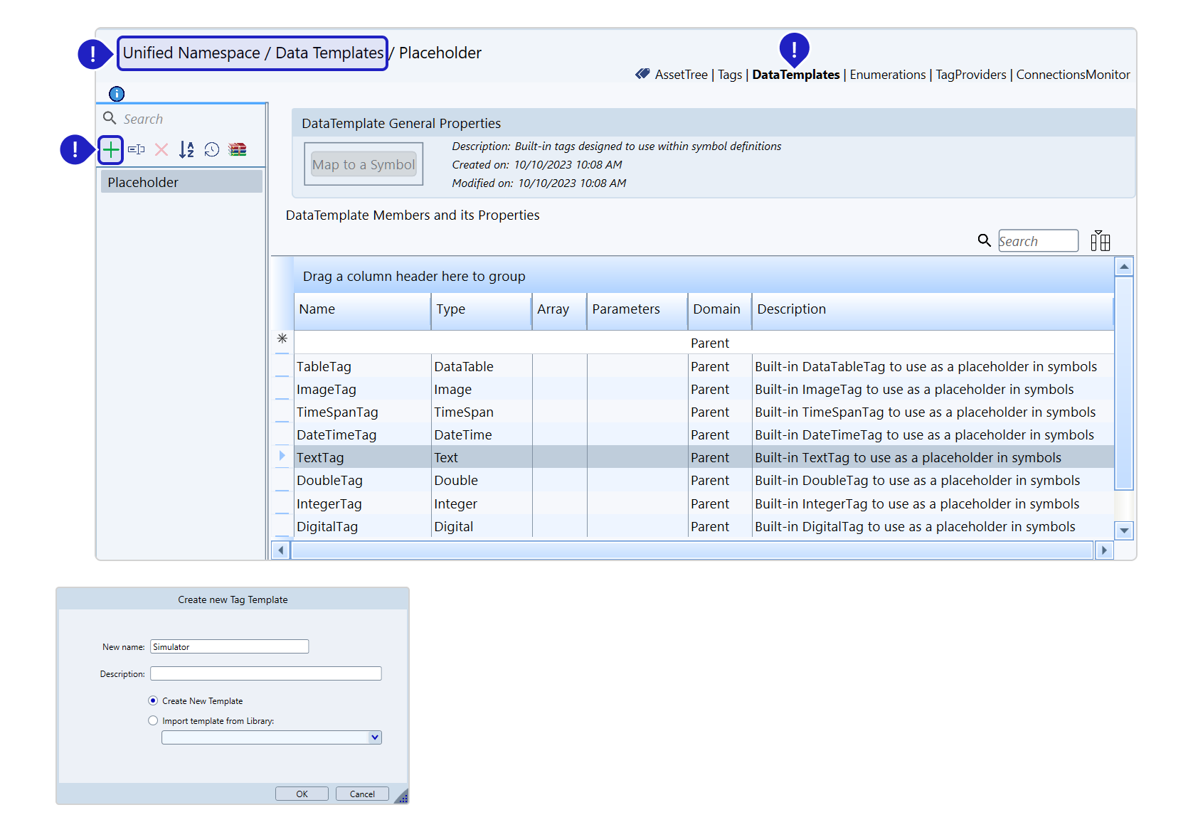 DataTemplates streamline the creation of tags by supplying predetermined attributes. By employing these templates, users can efficiently manage data by upholding a logical and hierarchical structure representing assets or informational models.