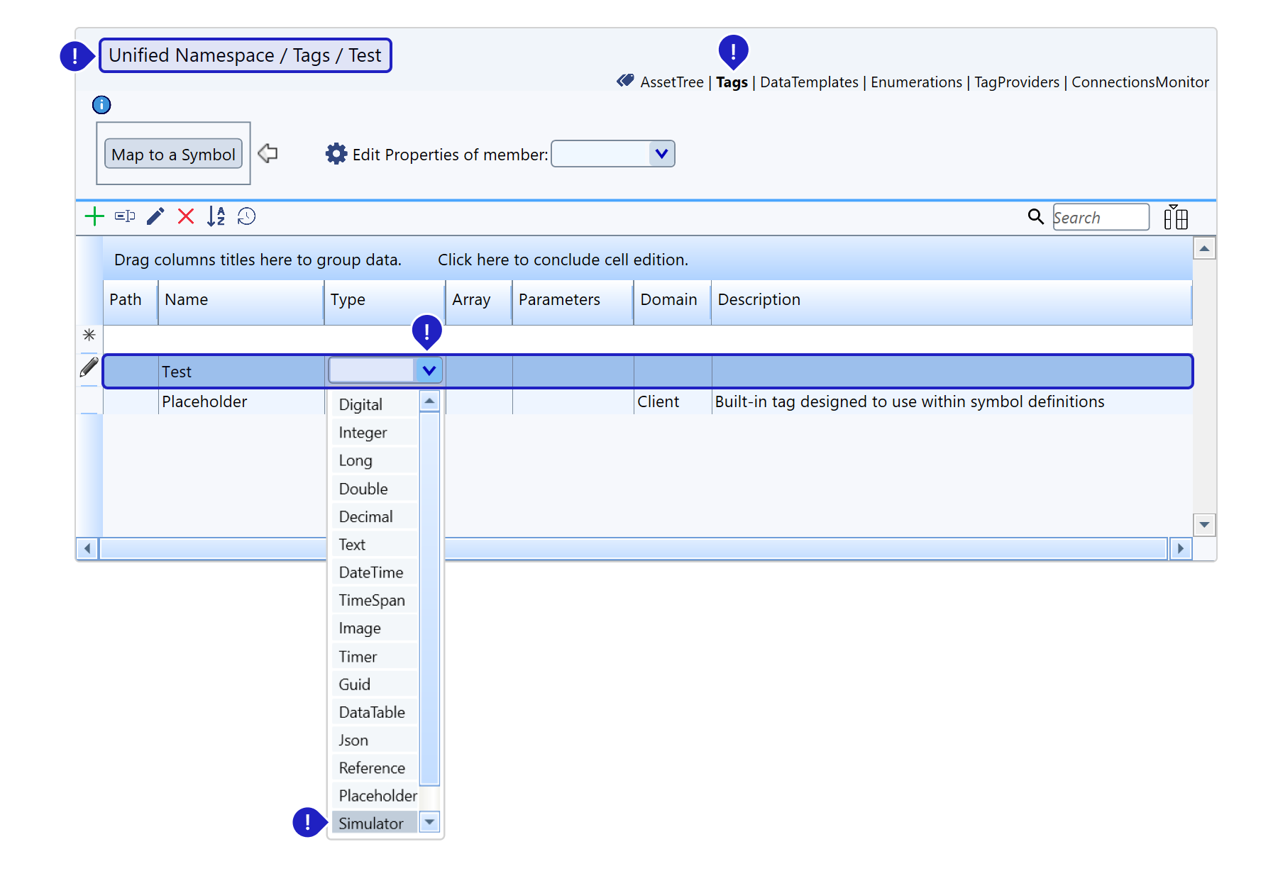 To create a new member for this DataTemplate, type into the first row of the table next to it and press enter after adding all the information. The properties here are the same ones for Tags. See Creating and Editing Tags for more information.