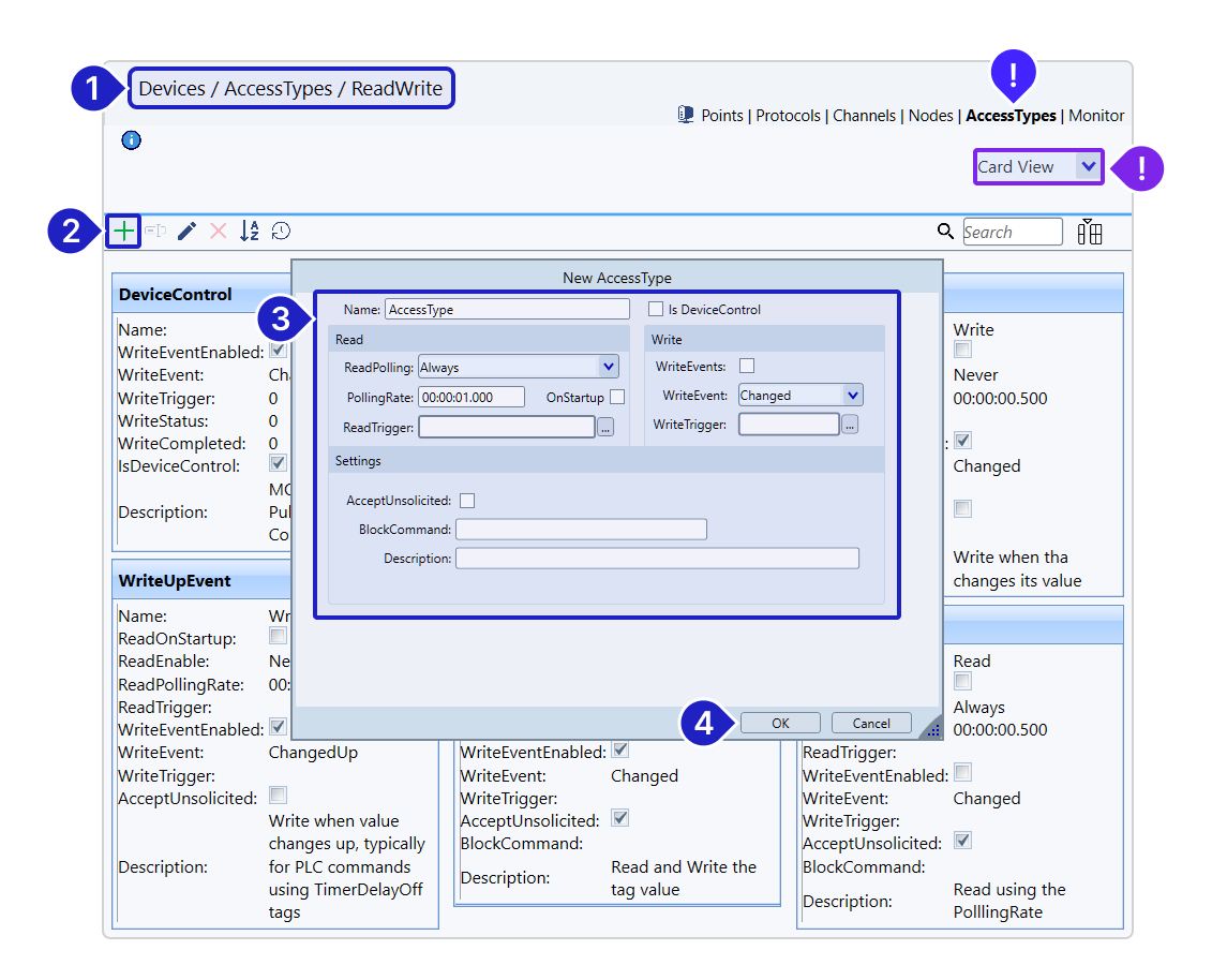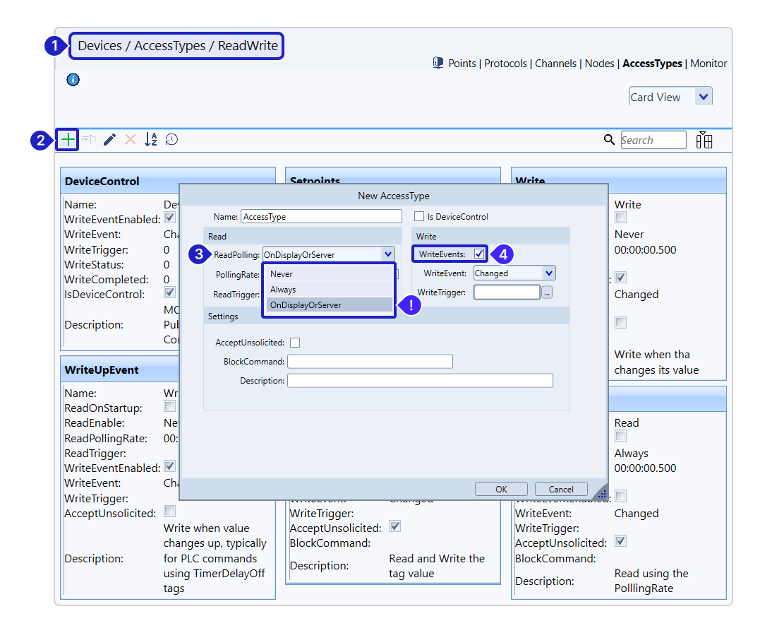 The Device AccessType defines the defines the rules for reading and/or writing values for Device Point. Each Point is associated with one AccessType.