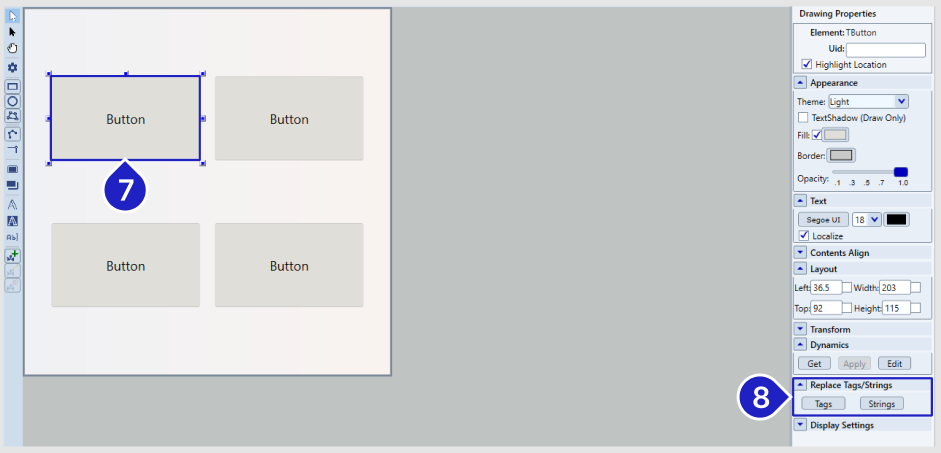 Replace tags and strings on the select elements in the displays. In the example below, it would automatically change all mentions of "Button" to "Button New" the the selected elements.